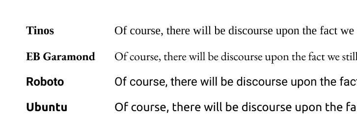 - Tinos (Times New Roman Alternative): Times is not available to distribute, so a free, closer alternative is used.
